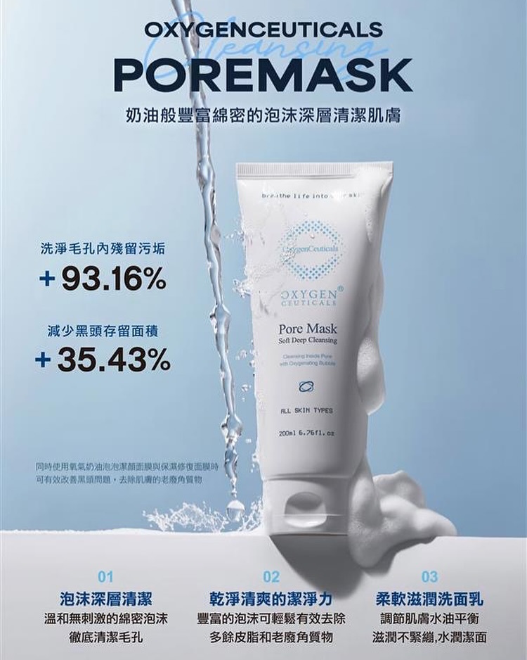 綿密如奶霜的氧氣泡泡,深入毛孔包覆髒污,溫和帶走老廢角質與殘妝。