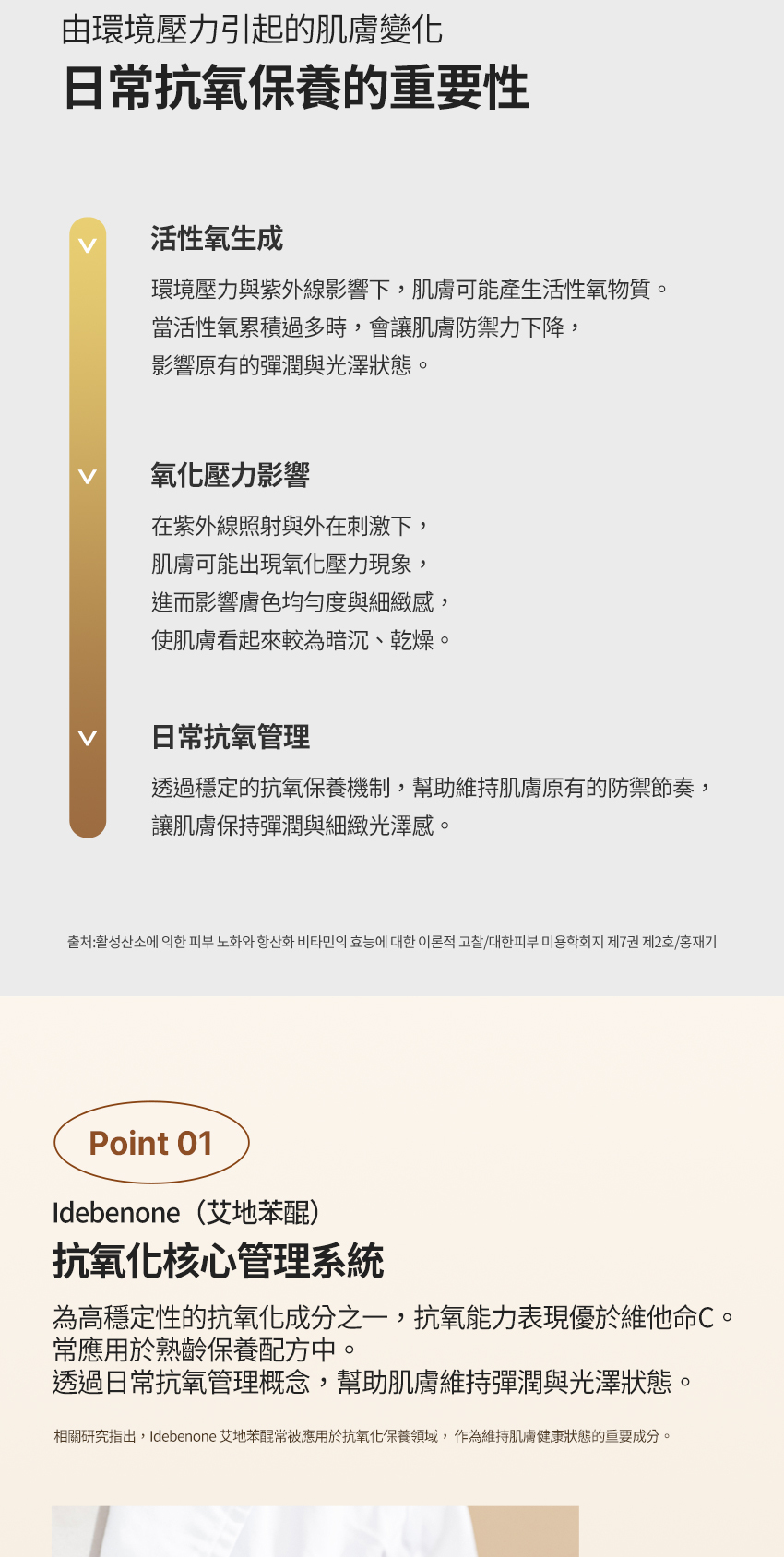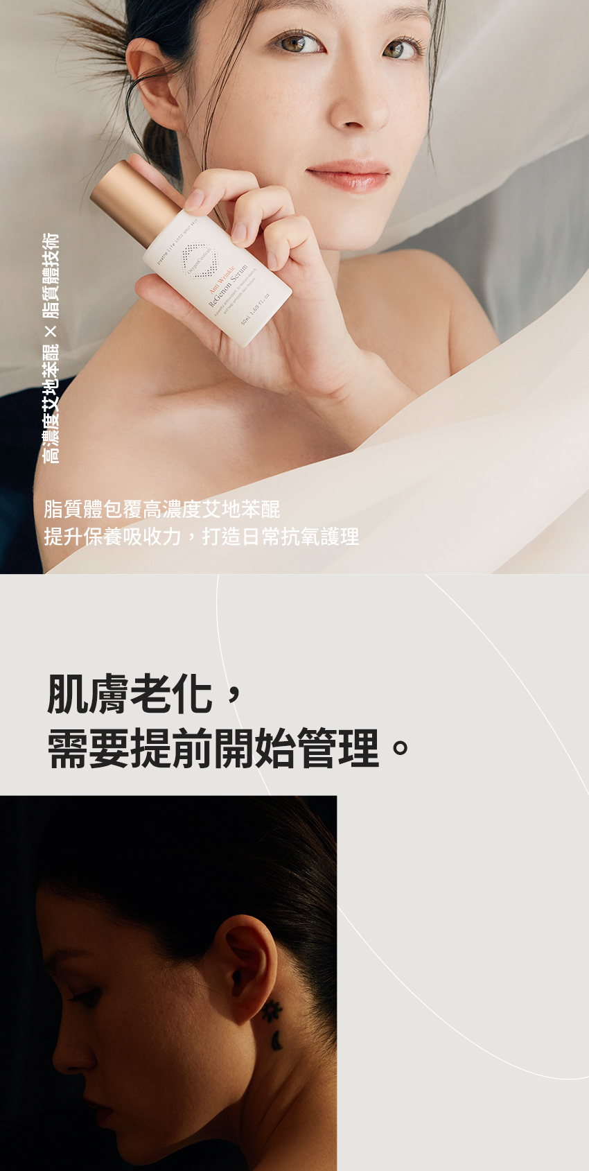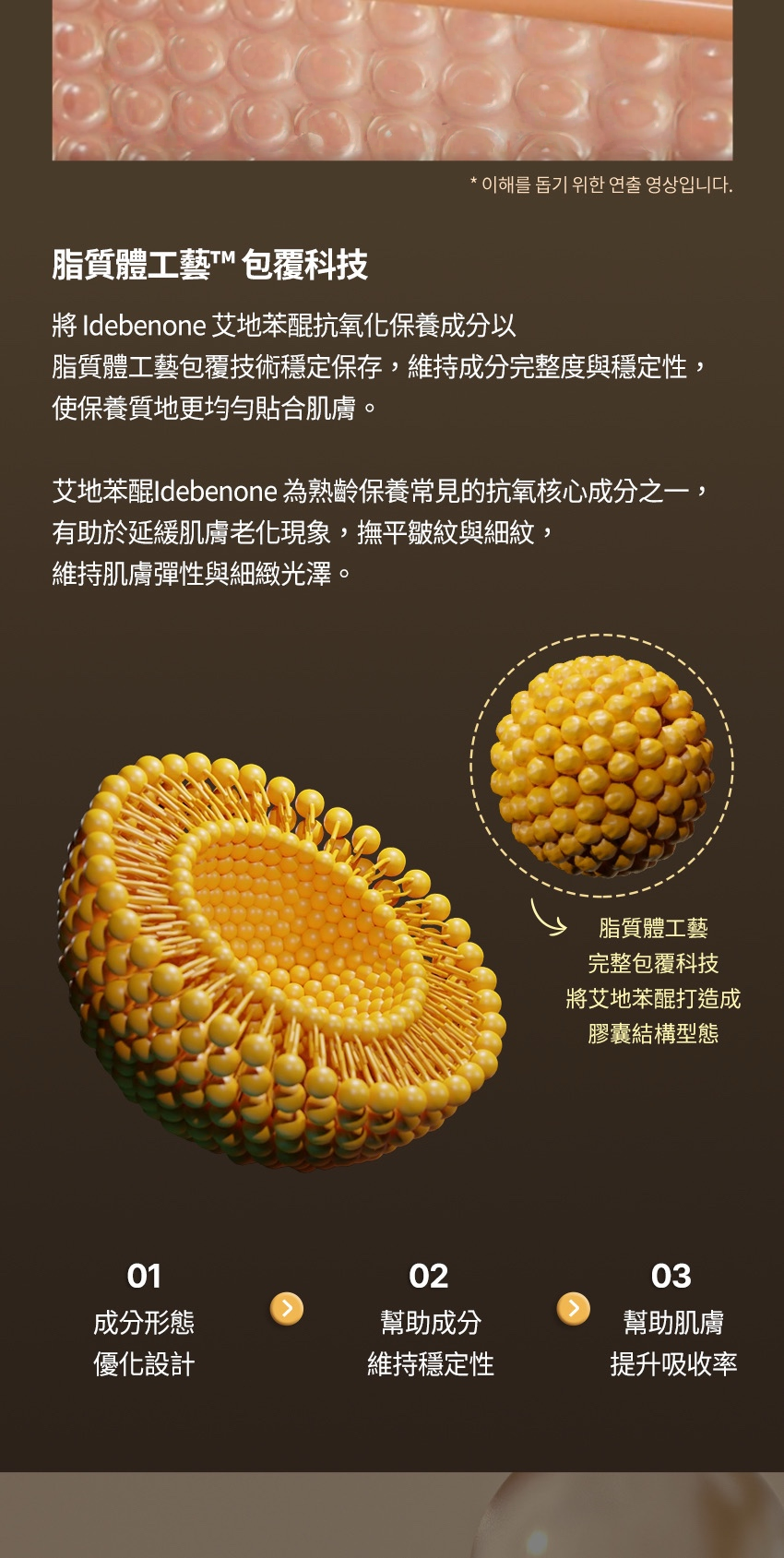 以 1.5% 艾地苯醌為核心,搭配脂質體包覆科技,幫助成分穩定包覆,為肌膚帶來亮澤、細緻與彈潤感。