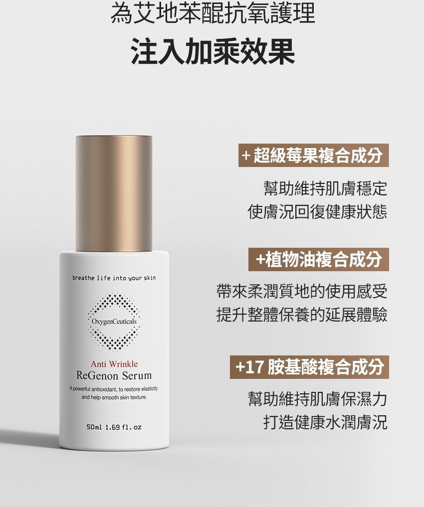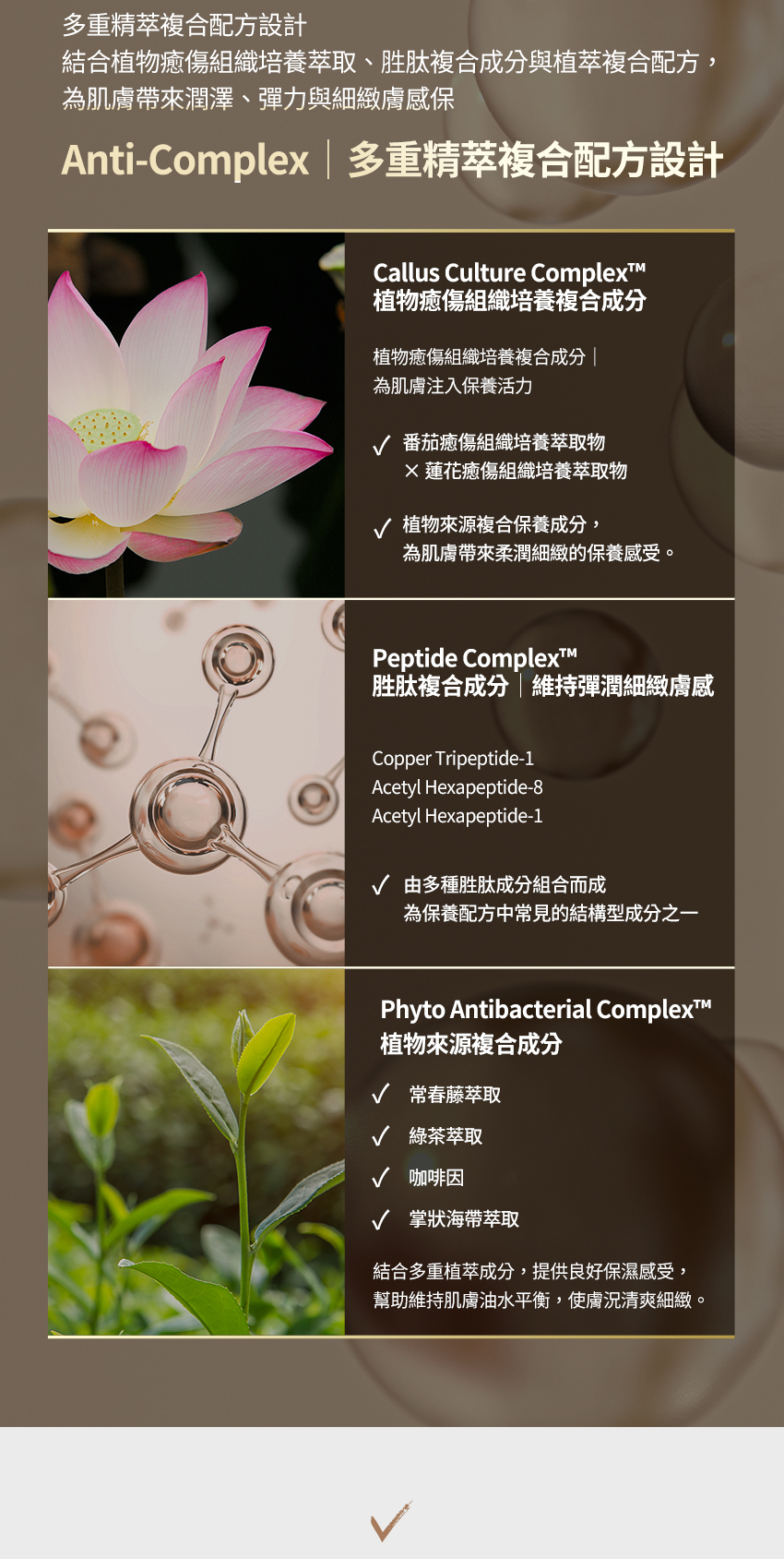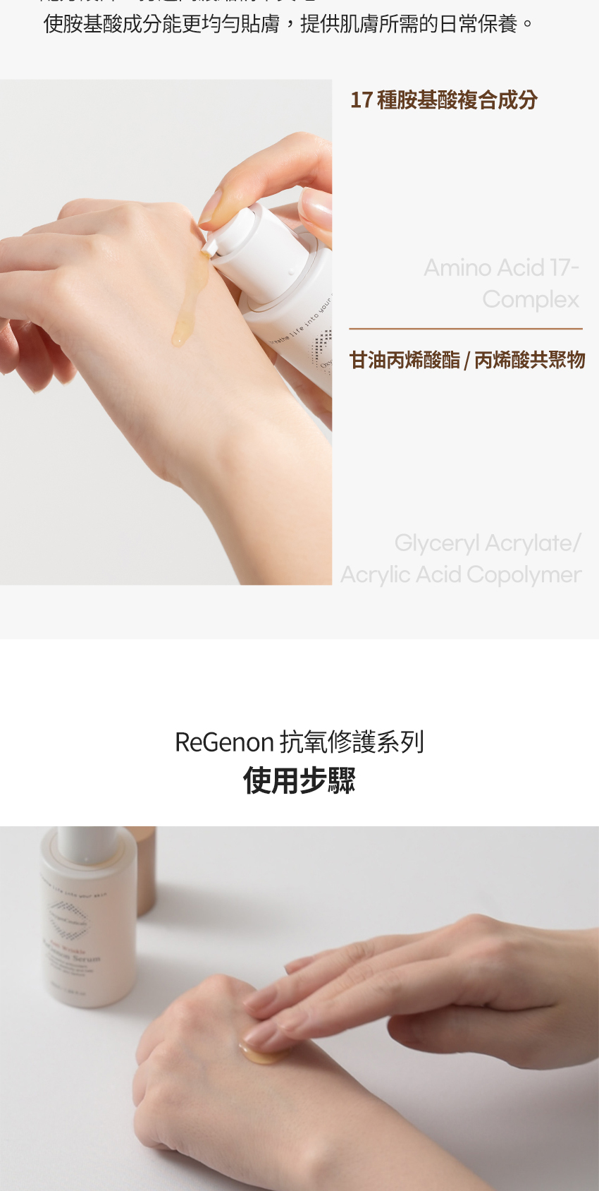 結合 7 種超級水果複合物 × 5 種植物精油複合物 × 17 種胺基酸複合物,打造高階抗氧保養配方。